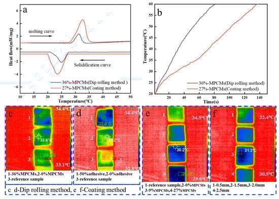 (a) Comparison of DSC curves between samples selected from dip rolling method and coating method, (b) Comparison of temperature rise curves between samples selected from dip rolling method and coating method, (c) Infrared thermogram of samples with different content of phase change microcapsules, (d) Infrared thermogram of samples with different binder content, (e) Infrared thermogram of samples with different content of phase change microcapsules, (f) Infrared thermogram of samples with different coating thickness.