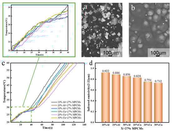According to the principle and preparation process described in Section 2.2.4, the infrared camouflage fabric is prepared by combining temperature-regulating phase change microcapsules with low emissivity metal materials. The SEM of low emissivity metallic copper powder and aluminum powder is shown in Figure 6a,b. According to the experimental results in Section 3.2, the content of phase change microcapsule is 27% and the coating thickness is 1.5 mm. Figure 6c shows the temperature rise curve of single-layer infrared camouflage coating sample after adding different kinds and contents of low emissivity materials. Figure 6d shows the infrared emissivity of the sample.