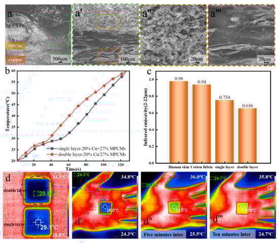 (a) Cross section SEM image of double-layer infrared camouflage fabric, (b) Comparison of temperature rise curves of single-layer and double-layer infrared camouflage fabrics, (c) Infrared emissivity of human skin, cotton fabric, single-layer and double-layer infrared camouflage fabrics, (d) Infrared thermogram of double-layer infrared camouflage fabric.