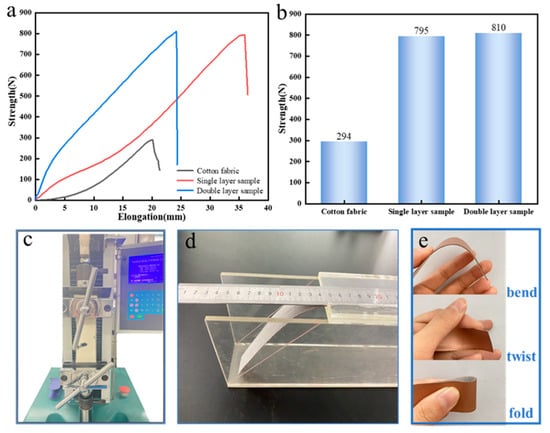 (a) Tensile strength displacement curve of infrared camouflage fabric, (b) Maximum tensile strength of infrared camouflage fabric, (c) Tensile strength test of infrared camouflage fabric, (d) Measurement of bending length of infrared camouflage fabric, (e) Soft performance display of infrared camouflage fabric.