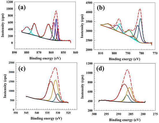 Figure 1a displays the Ni 2p spectrum, which manifests multiple prominent peaks. These peaks are subjected to fitting procedures, which involve the identification of the 2p3/2 and 2p1/2 peaks and the satellite peaks. The spectral peaks observed at 854.3 and 873.4 eV are attributed to the Ni2+ component, whereas the peaks detected at 856.1 and 873.2 eV are associated with the Ni3+ component in NiCo, as reported by Hao et al. [37]. The spectral features observed at 863.1 and 879.4 eV are identified as satellite peaks. The spectrum of Co 2p comprises two doublets resulting from spin-orbit coupling and two satellite peaks, as depicted in Figure 1b. The distinctive doublet peaks indicate the presence of the Co3+ component observed at 781.2 and 795.2 eV. The characteristic doublet peaks can identify the Co2+ component observed at 782.1 and 797.6 eV. The satellite peak observed at 788.6 and 804.2 eV can be attributed to the Co3+ and Co2+/Co3+ components, respectively, as reported by Marco et al. [38]. The spectrum of O1s (as depicted in Figure 1c) can be effectively modeled by three distinct peaks at 530.2, 531.1, and 533.18 eV; respectively. These peaks indicate metal-oxygen bonds, and oxygen defects [39,40,41]. The XPS spectrum of C1s (see Figure 1d), three peaks can be observed at binding energy of 287.1, 286.6, 285.2 eV attributed for C-O, C-N, and C-C; respectively [42,43].