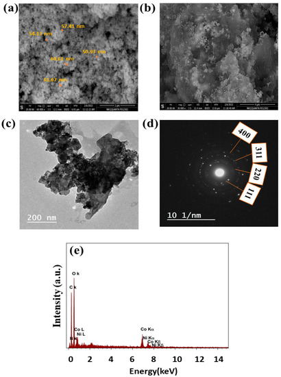 The conventional method for determining the dimensions of NiCo nanoparticles was the utilization of Transmission Electron Microscopy (TEM). The average particle size of NiCo was approximately ~60 nanometers. Figure 3c shows the TEM of NiCo@Chit. Thus, the nanosphere of NiCo was observed to be attached to the chitosan sheets. The corresponding TEM diffraction patterns are used to confirm the formation of NiCo on the chitosan sheet. As represented in Figure 3d, d-spacing was used to find the Miller indices (hkl) using ImageJ software. However, the observed rings can be attributed to planes of (400), (311), (220), and (111); respectively. The elemental analysis of NiCo@Chit was estimated by EDX. As a result, EDX indicates that Ni, Co, O, C, and N are present. Figure 3e displays the elemental compositions of the NiCo@Chit sample. As a result, the elemental percentages displayed in the inset figure match the target structure of NiCo, which has a Ni/Co ratio of 1 to 2.