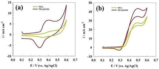 Figure 5a shows CVs of the modified NiCo and NiCo@Chit in 1.0 M KOH. One redox peak can be observed at a potential range of 0.3 to 0.45 V for conversion of Ni(OH)2 and NiOOH. Additionally, the urea oxidation can be represented in Figure 5b. Thus, strong oxidation peaks at potential ~0.5 V are attributed to the conversion of urea. However, a sample of NiCo@Chit utilized high activity compared to the unmodified NiCo sample. The presence of chitosan could enhance the activity toward urea electrochemical oxidation in the alkaline medium. The reason for higher activity toward urea electrochemical oxidation may be explained by the ability of chitosan to adsorb urea along with the extended surface area and enhancement of mechanical and chemical stability of chitosan-based samples compared with the unmodified NiCo samples [53,54,55]. Comparative studies between chitosan-based and unmodified NiCo were performed using several approaches. Table 1 summarizes some of the results of the NiCo and NiCo@Chit surfaces.