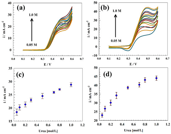 CVs of (a) GC/NiCo and (b) GC/NiCo@Chit electrodes in 1.0 M KOH and a wide range of urea concentrations. Relation between the urea oxidation current vs. urea concentrations using (c) GC/NiCo, and (d) GC/NiCo@Chit.