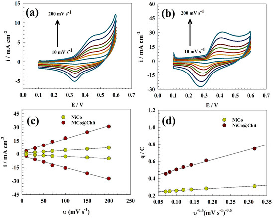 Additionally, various scan rates were used with the modified electrodes NiCo and NiCo@Chit in a solution of 1.0 M KOH as represented in Figure 7a,b. The following Equation (3) was used to estimate the surface coverage: