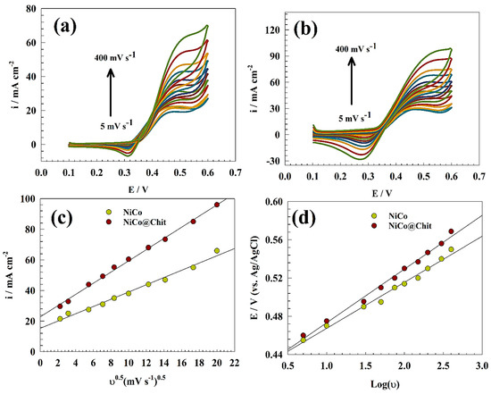 The CVs of the NiCo and NiCo@Chit modifications were presented in Figure 8a,b; respectively. The measurements were utilized in a solution of 1.0 M urea and 1.0 M KOH, with a scan rate ranging from 5 to 400 mV s−1 (vs. Ag/AgCl).