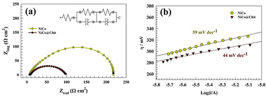 (a) Nyquist plots of NiCo and NiCo@Chit surfaces at 0.5 V potential. (b) Tafel plots of NiCo and NiCo@Chit.