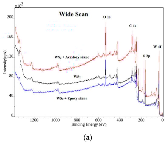XPS analysis of the pristine and surface-modified WS2 NPs was performed with the purpose of verification and quantification of the covalent bonds that were formed between the WS2 NPs and the silane moieties. Although ample evidence from past studies [] indicates that the IF-WS2 NPs are stable in the ambient, minor oxidation of surface defects and adsorption of different moieties from the ambient environment, occurring mostly in the cusps of the folded WS2 layers, cannot be fully excluded. Figure 1a shows the wide-scan XPS spectrum of the neat and silane-treated WS2 nanoparticles. This spectrum shows that the nanoparticles do not contain any extra impurity other than perhaps adsorbed water molecules or OH moieties []. The large oxygen signal visible in the spectrum can be ascribed to the silane moieties adsorbed to the nanoparticles’ surface with minor contribution also from other inadvertently adsorbed oxygenated moieties.