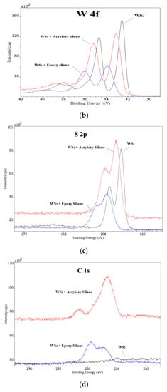 XPS spectra of the silane-treated WS2 nanoparticles; pure WS2 (black), WS2 coated with acryloxy silane (red), and WS2 coated with epoxy silane (blue). (a) Wide-scan XPS spectra; (b) high-resolution W 4f5/2; (c) S 2p; and (d) C 1s spectra.