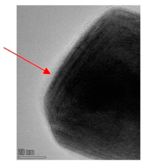 The (vinyl) silane-coated WS2 NPs were first analyzed by SEM (Figure 2d–f) and subsequently by TEM (Figure 3. The SEM analysis (Figure 2) of the functionalized NPs shows that they remained the same, and their overall shape and size were not affected by the surface treatment. TEM image (Figure 3) indicated that a relatively thick silane layer (4 nm) surrounded the surface-functionalized NPs.