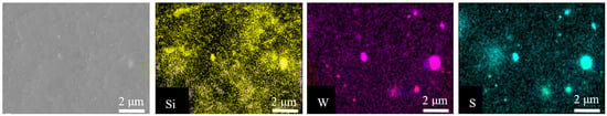 Figure 4 shows the EDS analysis for the EPGnTA specimen (#3) with 0.5 wt.% WS2 NPs coated with vinyl silane. The Si map (Figure 3a) shows a rather uniform distribution of the silica NPs in the epoxy resin. The silane layer surrounding the NPs was not visible in this analysis for a few reasons. First, the resin was highly insulating, and the silane coating layer on the NPs’ surface was rather thin and invisible on the silica NPs’ background. Furthermore, the overlap between the EDS signal of Si and W (2.2 keV) obscured the silane film. However, there was a good correlation between the sulfur and tungsten signals, which confirms the good quality of the WS2 NPs dispersion and distribution in the matrix.
