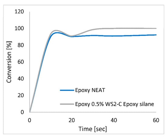 In our previous publication [], it was demonstrated that the optimal concentration of the WS2 NPs in radiation-induced polymerization of acrylates and epoxies is 0.5 wt.%. Thus, the present study is focused on the effect of 0.5 wt.% of WS2 NPs, which were functionalized by silane, on the mechanical and thermal properties of the resultant nanocomposites.