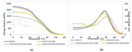 The Tg values for EPGnTA (#3) are shown in Table 2. In contrast to the acrylate case, here, no significant variations were observed after the addition of the WS2 NPs. However, there was a slight increase in the value of Tg for the EPGnTA (#3) with WS2 NPs after vinyl silane modification. This increase could indicate the formation of chemical bonds between the vinyl group and the polymer. Figure 7 shows the storage modulus and the loss modulus of the neat EPGnTA (#3) and the EPGnTA (#3) containing WS2 NPs in different forms. A decrease in storage modulus at low temperatures was observed with the addition of coated WS2 NPs. Above a temperature of 80 degrees, all the different EPGnTA (#3) compositions showed the same storage modulus.
