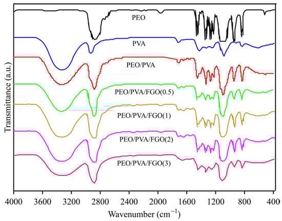 Figure 2. FT-IR spectra of PEO, PVA, PEO/PVA, PEO/PVA/FGO(0.5), PEO/PVA/FGO(1), PEO/PVA/FGO(2), PEO/PVA/FGO(3).