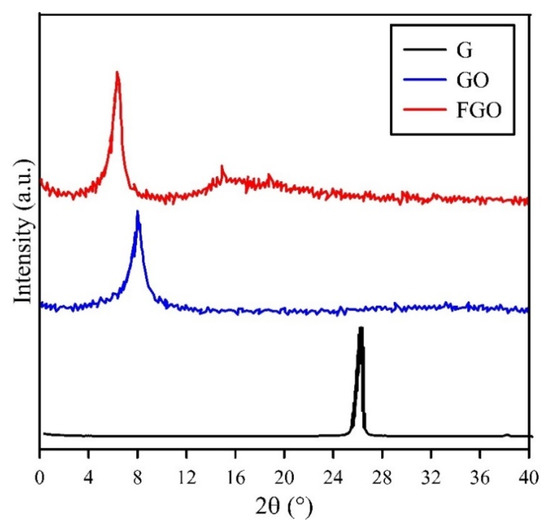The XRD patterns of G, GO, and FGO are demonstrated in Figure 3. For G patterns, the single peak at 2θ = 25.9° is related to (002) basal plane (d-spacing = 0.34 nm) [34]. For the GO pattern, due to the presence of oxygen-containing groups on the graphene surface, the desired peak shifted to 2θ = 7.6° (d-spacing = 1.1 nm), which indicates the exfoliation of nanolayers [35]. For the FGO pattern, by grafting PEG on the graphene surface, the peak shifted to 2θ = 6°. The diffraction angle decreased, indicating an increase in the d-spacing between the nanolayers compared to GO. A weak and broad peak at 2θ = 16.6° is due to the re-clustering of nanolayers [36].