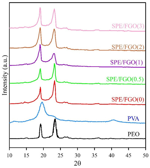 Figure 4 represents the XRD patterns of PEO, PVA, and SPEs. For the PEO pattern, the characteristic peaks at 2θ = 19 and 23.5° are corresponded to (120) and (112) reflection planes, respectively. These peaks show the semi-crystalline nature of PEO. PVA’s semi-crystalline nature has led to a broad peak at 19.5 and 22.6°, which corresponds to (101) and (10 1 ¯ ) planes, respectively. For the SPE/FGO(0) pattern, by merging two pure spectra, two peaks at 2θ = 19.1 and 23.4° correspond to the effect of two polymers with each other [37]. The degree of crystallinity of PEO, PVA, and SPEs are listed in Table 1. According to Table 1, embedding FGO nanolayers in SPE reduced the degree of crystallinity of the nanocomposite. In all SPEs, the characteristic peak of FGO is not observed, which indicates the excellent dispersion of FGO in the SPE bulk [38].