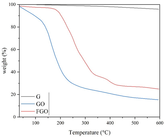 To evaluate the thermal stability of graphene types and nanocomposites, TGA was used. Figure 6 illustrates the TG curves of G, GO, and FGO. For G, no weight loss was observed until the temperature of 600 °C. A significant drop in the onset temperature of 150 °C has been observed for the GO. The weight loss below 150 °C is related to the reduction of water remaining between the GO layers, and weight loss above 150 °C is related to the decomposition of oxygen-containing groups on the surface of GO [39]. The successful oxidation of graphene nanolayers can be proved by comparing the TG curves of G and GO. The extreme weight loss of the GO to the char residual of 15.33% indicates the inappropriate thermal stability of GO nanolayers, but the FGO had higher stability than GO [40]. For FGO, the onset decomposition temperature was shifted to 200 °C. The increase of 50 °C in the onset decomposition temperature of FGO compared to GO indicates that the thermal stability of nanolayers with PEG grafting on GO nanosheets was improved. The TG diagram of the FGO sample shows two degradation steps in the temperature ranges of 220–330 °C and 350–450 °C. The first step, which has the largest decrease, is related to the degradation of oxygen-containing groups on the surface of graphene. The second step is related to the degradation of PEG [41,42].