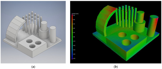 Scanning each pair of artifacts took approximately 50 min. After the scanning process (Figure 2b), the VGSTUDIO MAX 3.2.2 (Volume Graphics GmbH, Heidelberg, Germany) software was used for evaluation. This program allows users to filter out the two artifacts from the scanned point cloud, then separate them from each other and place them in space according to the three given planes using the 3–2–1 registration function. It is also possible to import the original CAD model in STEP format. This was placed in the same space using the same function as the scanned model, so it was possible to measure single-individual deviations and present them using a color map. In addition to the color map, some specific dimensions and angles were also measured, e.g., the dimensions of all pins, internal holes, angle of maximum inclination, and a large statistical set of 16 pins for the string-wrap test, which gives a good indication of the accuracy and repeatability of the print.