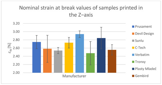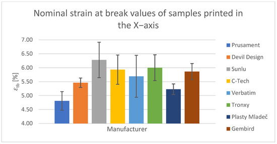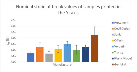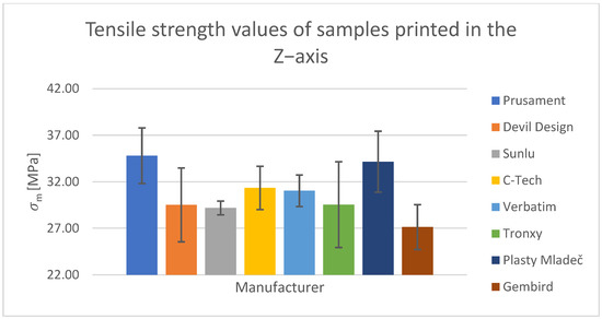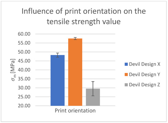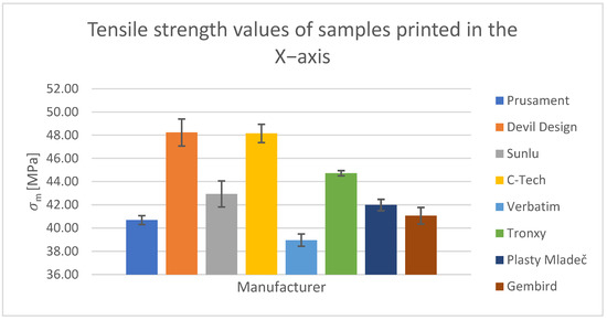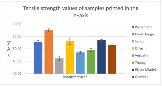 The obtained test results pertain to three axes: X-axis (Figure 3 and Figure 4), Y-axis (Figure 5 and Figure 6), and Z-axis (Figure 7 and Figure 8). The tensile test, as depicted in Table 2, revealed that the optimal print orientation in terms of strength was along the Y-axis. Devil Design exhibited the highest strength, of 57.5 MPa, in this orientation. Similarly, on the X-axis, Devil Design also achieved the most favorable results, attaining a strength of 48.2 MPa. Conversely, the poorest results in terms of orientation were observed in the Z-axis, while Prusament performed the best with a strength of 34.8 MPa. These outcomes contradict the findings of previous studies [17,20,24], where the authors suggested that the X-axis orientation outperformed the Y-axis orientation in terms of strength. However, our results align with another study where samples printed along the Y-axis demonstrated over three times higher tensile strength [19].