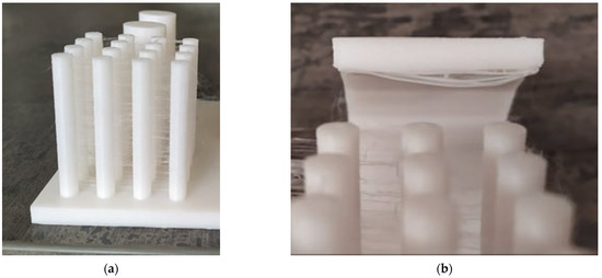 Prusament and Plasty Mladeč achieved the best results in terms of stringing rates (Figure 12a), with both manufacturers essentially exhibiting no stringing issues. Devil Design, Gembird, and Verbatim had slight instances of stringing, but still within acceptable limits. On the other hand, Tronxy and C-Tech exhibited significant stringing, while Sunlu recorded the worst results, with its 16 pins covered by dense networks of “webs”. The problem of stringing was not limited to the pins but also appeared during transitions from pins to overhangs. One of the pins displaying stringing can be observed in the provided image.