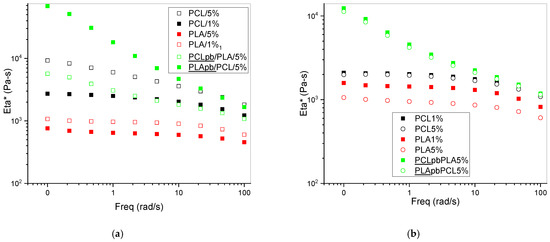 (a) Viscosity of PCL, PLA and PCL/PLA 50/50 containing CNW1 (~30% deacetylation). (b) Viscosity of PCL, PLA and PCL/PLA 50/50 containing CNW2 (<5% deacetylation). Eta*—complex viscosity.