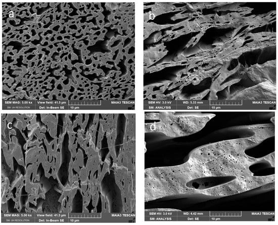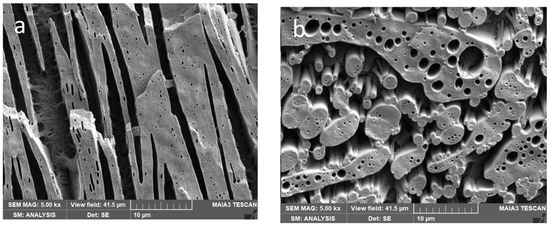 The structure was examined using scanning electron microscopy (SEM) with a Maia microscope (FEI, Brno, Czech Republic). The injection-moulded specimens broken under liquid nitrogen were etched in 20% NaOH for 20 min to remove the PLA component in the PCL matrix and bicontinuous samples; the PLA matrix samples were etched with THF vapour at 45 °C for 4 min to “visualize” PCL inclusions [41].