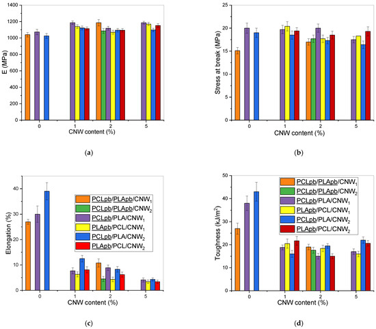 Mechanical properties in dependence on CNW content and mixing protocol (a) Young’s modulus E; (b) stress at break; (c) strain at break; (d) toughness. Legend to all graphs are shown in (c,d), e.g., PCL/PLApb/CNW2 means system prepared using PLA pre-blend; PCLbp/PLApb without CNW application means DMF treated components.