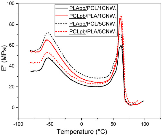 Examples of thermal dependence of the loss modulus for the PCL/PLA system with the PCL/CNW1 or PLA/CNW1 pre-blend are shown in Figure 8; the Tg of all systems prepared are in Table S1. It is obvious that trends (shifts of Tg) observed for blend-based NC prepared using PCL/CNW or PLA/CNW pre-blend mostly follow those found for a corresponding single-matrix NC, but usually more significant altering of both Tg values indicates the presence of further effects. Especially in the case of parallel using of the pre-blends of both polymeric components with CNW1 or CNW2, a certain merging of both Tgs indicates their compatibilising effect. The more “asymmetric” changes in respective PCL/CNW or PLA/CNW pre-blends, also with a higher probability of interfacial localization of CNW, correspond to CNW-induced changes in the structure and interface. A minor decrease in the Tg of PLA may be also caused by a PCL dissolved in the PLA phase [53]. In particular, formation of a complex hierarchical structure most probably leads to micromechanical transitions [54], which may significantly influence Tg in oscillatory straining-based measurements. It is obvious that the DMA results correspond to marked structural transformations dependent on NF type, content and localization.