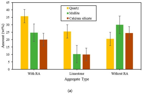 Figure 10 and Figure 11 shows both the mineralogical changes and the quantity of the different type of aggregate after 28 and 90 days of curing time. According to Figure 10 and Figure 11, it is noticed that quartz and mullites are the main crystallized products; none of these minerals can be observed in the limestone. The peak intensity of quartz phase enhanced with the addition of both RA and alkaline content, which is assigned to the introduction of silicon source, promoting the more formation of C-S-H gel and a long period time of hydration reaction. It also indicated that the more reaction production especially mullite formed with the addition of RA and good control of alkaline mix ratio, implying the reduction of CH due to the silicification of calcium sources. Just because of the introduction of abundant silicon source, the diffraction patterns of cristobalite enhance obviously due to the unreacted RA remains existent. In addition, the good amount of fly ash content in the design results in the peak intensity of both mullite and quartz which leads in the reduction of micro-porous groups hence, reduce voids.