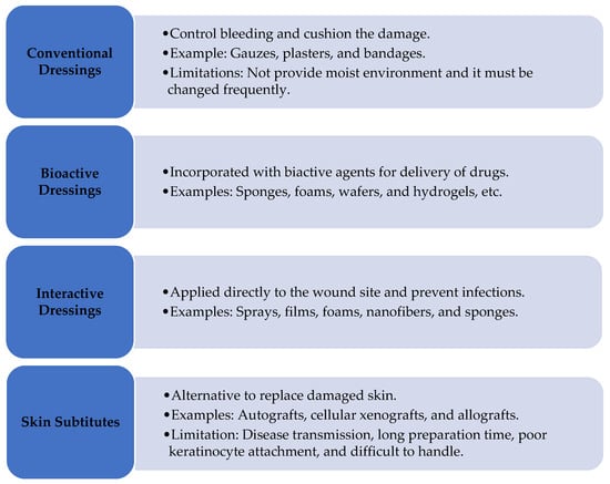 Acute or chronic wounds need proper treatment to evade any shortcomings that may arise throughout the healing process. Conventional, bioactive, and interactive dressings and skin substitutes are applied to treat wounds [19] (Figure 2). Conventional wound dressings, or passive dressings, protect wounds against external substances, infection, and damage. Additionally, these dressings function to control blood, cover and absorb wounds, and cushion the damage. Examples of conventional dressings are gauze, plasters, and bandages. However, some limitations of these dressings are that they do not provide a moist environment to the wound bed [34] and must be changed frequently during the healing process, which may cause more skin damage [35].