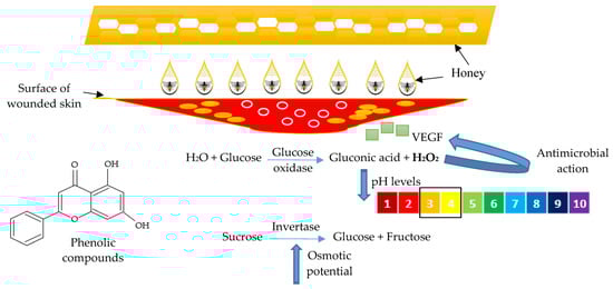 Additionally, hydrogen peroxide (H2O2) production on glucose is another characteristic of honey that causes antimicrobial action. This compound catalyze by glucose oxidation of glucose which lead to the production of gluconic acid and hydrogen peroxide [68]. The formation of gluconic acid contributes to a decrease in pH levels, while hydrogen peroxide enhances the antimicrobial properties of honey. This cascade of events, which includes pH reduction to levels between 3.5–4.0, is crucial for initiating the tissue repair process [68,69]. Furthermore, H2O2-dependent honey may stimulate the synthesis of vascular endothelial growth factor (VEGF) and sterilize the wound site [22]. In addition to glucose oxidase, bees create invertase, which enhances the osmotic potential of honey by breaking down sucrose into fructose and glucose (Figure 4) [69]. The production of H2O2 also tends to be toxic to the cellular tissue when it is too saturated. However, it can be countered with an antioxidant compound inside the honey [70].