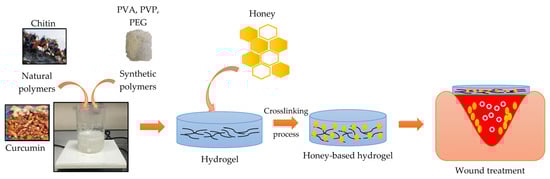 Hydrogels combined with honey have multiple benefits and are considered ideal wound dressings to promote healing [20,78,79] (Figure 5). Hydrogels are 3D structures crosslinked with hydrophilic characteristics that can hold abundant volumes of water and other liquids [11,80]. Thus, it is applicable for wound healing due to its high porosity, excessive water content, ability to release therapeutic agents, excellent biocompatibility, biodegradability, and it can accelerate the wound healing process [5,19,81]. Furthermore, honey has been traditionally utilized as a wound dressing to accelerate and enhance the process of wound healing. Therefore, incorporating honey into the hydrogel could be effective for wound healing [20,82].