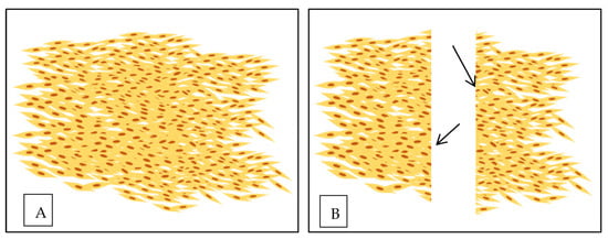 Illustration of in vitro wound healing assay. (A) Fibroblast cells form a confluent monolayer. (B) In vitro “wound” was created by a straight line scratch across the fibroblast monolayer [94].