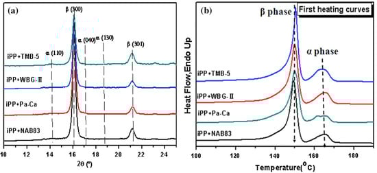 (a) WAXD and (b) DSC diagrams of the β-iPP cast film, which contain four different nucleating agents [42].