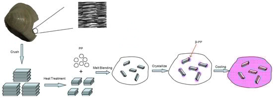Polypropylene (PP) was synthesized by Natta for the first time in 1954, and the Montecatini Company of Italy realized its industrialization in 1957. With the rapid development of the PP industry, it has become the thermoplastic general resin with the largest output and the widest use. The macroscopic properties of the material are derived from its microstructure, and the crystallinity, crystal form, and crystal structure of PP play a key role in its properties. The crystalline structure of PP mainly includes α [1], β [2,3], γ [4], δ [5], and the quasi-hexagonal state [6]. α- and β-crystals have been widely studied when compared with the other crystal forms described. In its usual state, PP exists as an α-crystal and belongs to the monoclinic crystal system. Its molecular chain is left-handed, or right-handed when around the central axis. The spiral conformation is the most stable crystal form of polypropylene; meanwhile, the β-crystal belongs to the thermodynamic quasi-stable and kinetically unfavorable crystal form, which requires special conditions in order to obtain it. Padden and Keith first reported the quasi-hexagonal β-crystal of polypropylene in 1959 [7]. Turner-Jones et al. [8] believed that the β-crystal was a hexagonal structure crystal, which influenced the academic community for more than 20 years. It was not until 1994 that Meille [9] and Lotz [10] independently established that the β-crystal was a rhombohedral crystal structure, and that the unit cell parameters were a = b = 11.01 Å, c = 6.5 Å, α = β = 90°, γ = 60°, and a density of 0.921 g/cm3. Due to their unique molecular structure, β-crystals have a great influence on the properties of materials, as well as on final products such as the toughness, elongation at break, heat resistance, etc.