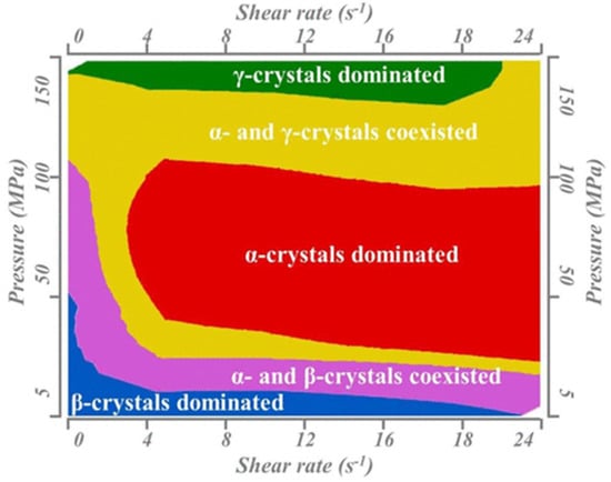 Pressure plays the role of a generalist in the presence of shear flow as shown in Figure 4 [120]. A large number of β-crystals can be obtained in the range of a low pressure of 5 MPa and a shear rate 0–24 S−1. Low shear can significantly inhibit the production of β-crystals when the pressure and shear rate are 50–100 MPa and 3.2 S−1. There is no β-crystal that can be produced when the pressure is 150 MPa. The processing window of pressure and shear flow is summarized for the first time, and this provides an important reference value for the processing conditions of βPP. In addition, pressure also induces the formation of different crystalline states. When the pressure increases, the β- and γ-crystals decrease and the β-nucleating agent can also induce the formation of γ-crystals in a wide pressure range [121].