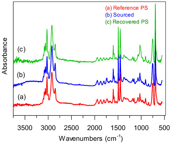FTIR spectra for the (a) reference, (b) source, and (c) recovered PS samples.