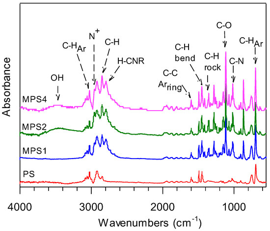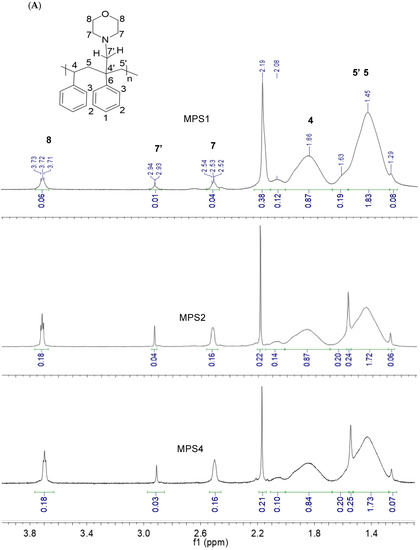 New medium-intensity peaks observed at 1020 cm−1 attributed to the C-N bending vibrations with the corresponding absence of the N-H bending vibration at 1580–1650 cm−1 in all MPS polymers allude to the successful integration of the functionalized tertiary amine on the PS backbone via an iminium intermediate following the Mannich mechanism. Interestingly, the FTIR spectra for all MPS samples show a peak with mildly incremental intensity from MPS1 to MPS4 for the N-H stretch associated with the formation of an amine salt (N+). The appearance of this peak confirms the formation of a tertiary amine due to successful C-C coupling which acts as a base in the presence of condensation emerging from the Mannich reaction. This result is significant because of the implications of the functionalized material in charge transfer or ion-exchange processes and applications. The appearance of the C-H stretches at 2789 cm−1, which are at a lower frequency than the C-H stretches of alkyl groups (2851 cm−1), indicate the formation of the new R-C-H alpha bond to nitrogen. This bond formation is also confirmed by the concurrent appearance and increase in intensity for peaks at 1353 cm−1 assigned to CH2 rocking vibrations in all functionalized polymers, also observed in amorphous regions in polyethylene [73]. An increase in the C-O peaks at 1112 cm−1 from MPS1 to MPS4 also supports the intramolecular transfer of the morpholine–iminium ion to the activated benzylic carbon of polystyrene with an increasing ratio. The O-H bending vibrations at 1410 cm−1 and the O-H stretching vibrations at 3469 cm−1 in the functionalized polymers indicate that the polymer chains are terminated due to oxidation/hydrolysis. These peaks are absent in PS and are weak in MPS1, but are most pronounced in MPS2 and MPS4, indicating an incremental rise in hydrogen bond density due to hydrolysis. These results support the results in Table 2 for the sustained intrinsic viscosity for MPS4. The presence of the hydroxyl region in FTIR also supports the higher integration of the chemical shift for CH2-O at 3.71 ppm attributed to the inserted ring protons but also from protons adjacent to latent and formed terminal hydroxyl groups. The absence of peaks near 1720 cm−1 for the carbonyl stretch in aldehydes, C=N bond vibrations near 1690 cm−1 for the imine intermediate, and a N-H stretch in morpholine confirm that the reactants have completely reacted.