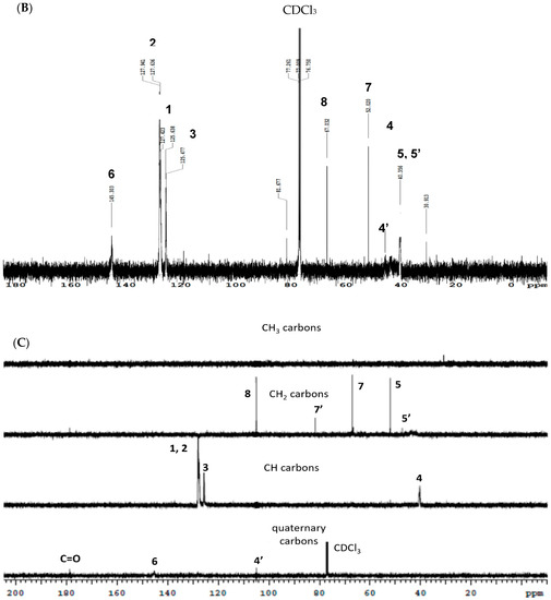 Nuclear magnetic resonance spectroscopy measurements (1H NMR (proton) and 13C (carbon) NMR) were recorded on a 500 MHz spectrometer (Bruker Advance III 400 spectrometer (BrukerBioSpin MRI GmbH, Karlsruhe, Germany) using a 5 mm BBO probe at 25 °C. Samples were prepared by dissolving approximately 30 mg of sample in 0.6 mL of CDCl3 solvent. The 1H NMR spectra were acquired for 4 s, collected over an 8000 Hz spectral window, with 24 transients, 64,000 data points, proton pulse of 5.35 µs, and 10 s delay. 13C NMR spectra were acquired for 2 s, collected over a 31,000 Hz spectral window, with 520 transients 130,000 data points, 4.5 µs pulse, and 1 s relaxation time. The 13C DEPT NMR spectra were acquired for 2 s, collected over a 31,000 Hz spectral window, 128 transients, 4 µs pulse, and 1 s delay.
