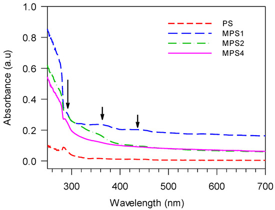 The recovered PS shows a characteristic maximum absorbance at 285 nm, which is present in all functionalized polymers as well (large arrow in Figure 5). All functionalized polymers show a higher absorbance than PS but decrease in the order MPS1 > MPS2 > MPS4. MPS1 has the highest absorbance commensurate with the maximum functionalization of the polymer. Absorbance peaks at higher wavelengths—originating from interactions between electron-rich oxygen and nitrogen moieties in the functionalized polymer and the freely rotating phenyl structures of the PS chain [74]—are also observed clearly for MPS1 (small arrows in Figure 5). MPS2 and MPS4 show a broad shoulder at lower wavelengths, also emerging from similar but weaker interactions, which leads to a reduced overall absorbance. The UV spectral data confirm the 1H NMR and FTIR structural characterization that the most effective functionalization of PS via C-H activation in the multi-component Mannich reaction is achieved for MPS1.