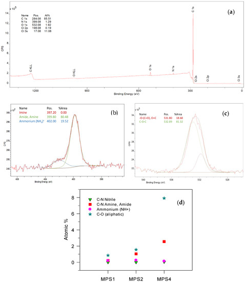 (a) XPS survey scan of MPS2, (b) the deconvoluted peaks for N 1s and (c) O 1 s spectra, and the (d) atomic percentage and speciation of carbon and nitrogen in the functionalized polymers.