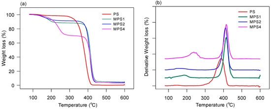 TGA curves for recovered PS and the MPS with varying ratios. (a) Percentage weight loss and (b) derivative percentage weight loss.