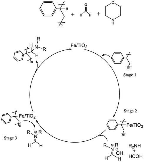 The modified Mannich 3CR between the formaldehyde, morpholine, and benzylic C-H of the polystyrene proceeds through the C-H bond activation by the transition-metal catalyst, forming a R-C-Fe-TiO2 intermediate at the benzylic position (Stage 2, Scheme 1). This promotes the scission of the bond at this position for the subsequent C-C coupling step. The intermediate that is estimated to be stabilized by the π alkyne–metal complex in A3 reactions is proposed to be stabilized in this 3CR reaction via electron delocalization in the activated π aryl-Fe complex in the atactic polystyrene. This stabilized intermediate reacts with the iminium ion that is produced in situ (stage 2, Scheme 1) by the reaction of formaldehyde and morpholine (stage 3, Scheme 1) to form the functionalized polystyrene–amine product, regenerating the catalyst.