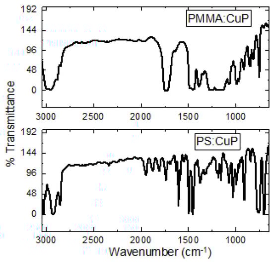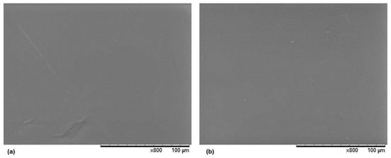 In order to complement the surface morphology of the PMMA-CuP and PS:CuP films, they were analyzed by SEM and Figure 4 shows the images at 800×. It can be observed that both images exhibit the same continuous and homogenous surface, with minor imperfections due to the manufacturing process. This implies that the CuP is homogeneously distributed within the polymeric matrix in both films