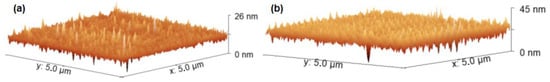 In order to know the surface topography and roughness of the PMMA-CuP and PS:CuP films, they were analyzed by AFM and Figure 3 shows the images at 5 × 5 μm. The hybrid films exhibit a very uniform topography with some ridges, probably related to preferential directions of growth. However, in both films, it would appear that the porphin is completely embedded in the polymeric matrix. Regarding the root mean square (RMS) roughness, the film with PMMA is less rough than the film with the PS matrix, the values obtained are 2.59 and 3.66 nm, respectively. The low roughness and adequate homogeneity of hybrid films make them susceptible to being used as components in optoelectronic devices; however, it is necessary to complement the morphological characterization by SEM.