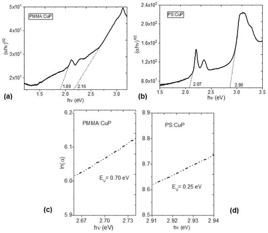 (a,b) Relation between (αhν)1/2 vs. hν energy and (c,d) relation between ln(α) vs. hν energy for the PMMA:CuP and PS:CuP films.