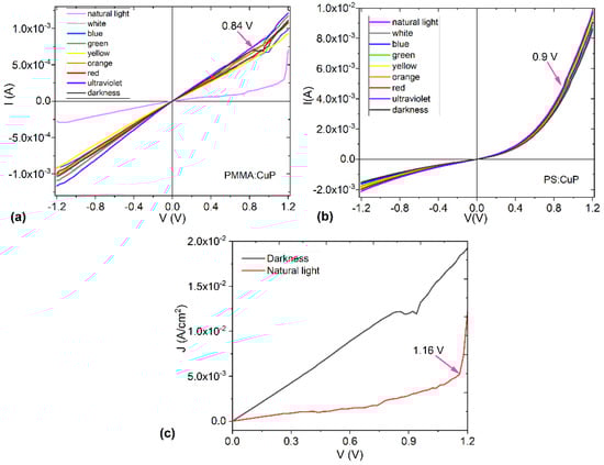I-V characteristic curves of the (a) glass/FTO/PMMA:CuP/Ag and (b) glass/FTO/PS:CuP/Ag devices under different incident light color. (c) J–V characteristic curves of glass/FTO/PMMA:CuP/Ag under light and darkness conditions.