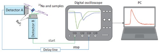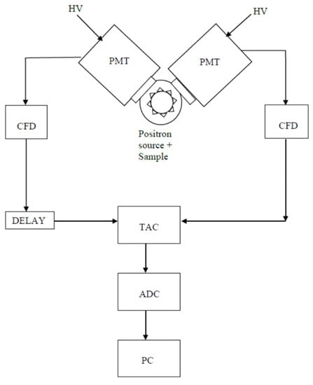 Figure 1 is a sketch of a PALS timing spectrometer [57], showing two channels: each one consists of a scintillator coupled to a photomultiplier tube (PMT). The scintillator converts the γ-rays into UV-vis photons, which when hitting the PMT photocathode generates photoelectrons. The most commonly used scintillators are organic (plastic) or fast inorganic (BaF2). A constant fraction discriminator (CFD) on each channel generates a fast-timing signal whenever a γ-ray with the correct energy (start or stop) is detected. A time-to-amplitude converter (TAC) activated by the start CFD produces a voltage linearly increasing with time and terminated at the arrival of the stop signal from the other CFD, so that the signal from the TAC is proportional to the lifespan of the positron. This signal, digitized by an analog-to-digital converter (ADC), is transferred to a personal computer (PC). Recently, silicon photomultipliers (SiPM) have been successfully used in the place of traditional PMT [58,59].