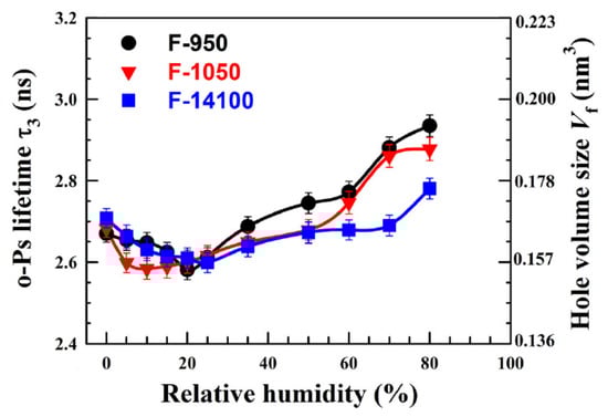 In another study on three commercial per-fluorinated sulfonic acid/PTFE proton exchange membranes [73] similar to Nafion, o-Ps lifetime was studied as a function of time at 70% RH and versus RH, in both cases at room temperature. o-Ps lifetime increases with time, leveling off after about 60 h, which is explained in terms of accumulation of water molecules inside the membranes. Indeed, when the membrane is saturated with water, its nanostructure is stabilized and the hole volume does not change any more. The behavior of o-Ps lifetime with RH is non-monotonous (Figure 3): by increasing RH, lifetime first decreases due to the filling of hole volumes by water molecules. At RH > 20% o-Ps lifetime begins to increase; this is interpreted in terms of membrane plasticization induced by higher water content, which involves an increased hole volume.