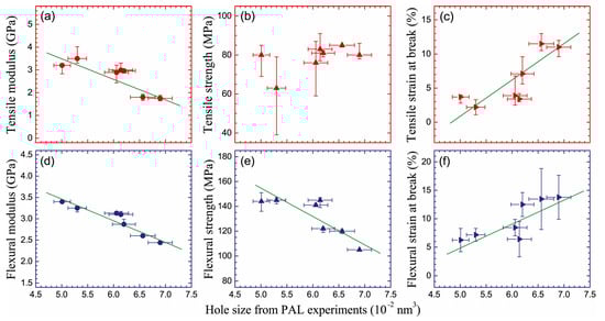 Another study on crosslinked PVA/SSA proton exchange membranes was undertaken [75], to study the effect of different concentrations of sulfosuccinic acid (SSA) on the properties of PVA membranes. Free volume as determined by PALS supplies a microscopic interpretation of the tensile strength versus the SSA content, which decreases above 15 wt%. Indeed, o-Ps lifetime increases when SSA content > 15 wt%: bigger free volume holes reduce the interactions among the polymer segments, and the corresponding higher chain mobility gives flexibility to the structure, decreasing the tensile strength. A similar conclusion was reached in a study concerning seven chemically different amine-cured epoxy resins [76]: a negative correlation between tensile modulus/flexural modulus and hole volume has been shown, while tensile/flexural strain at break are positively correlated with the hole volume (Figure 4). This allowed the authors to conclude that smaller hole sizes correspond to better tensile and flexural mechanical properties.